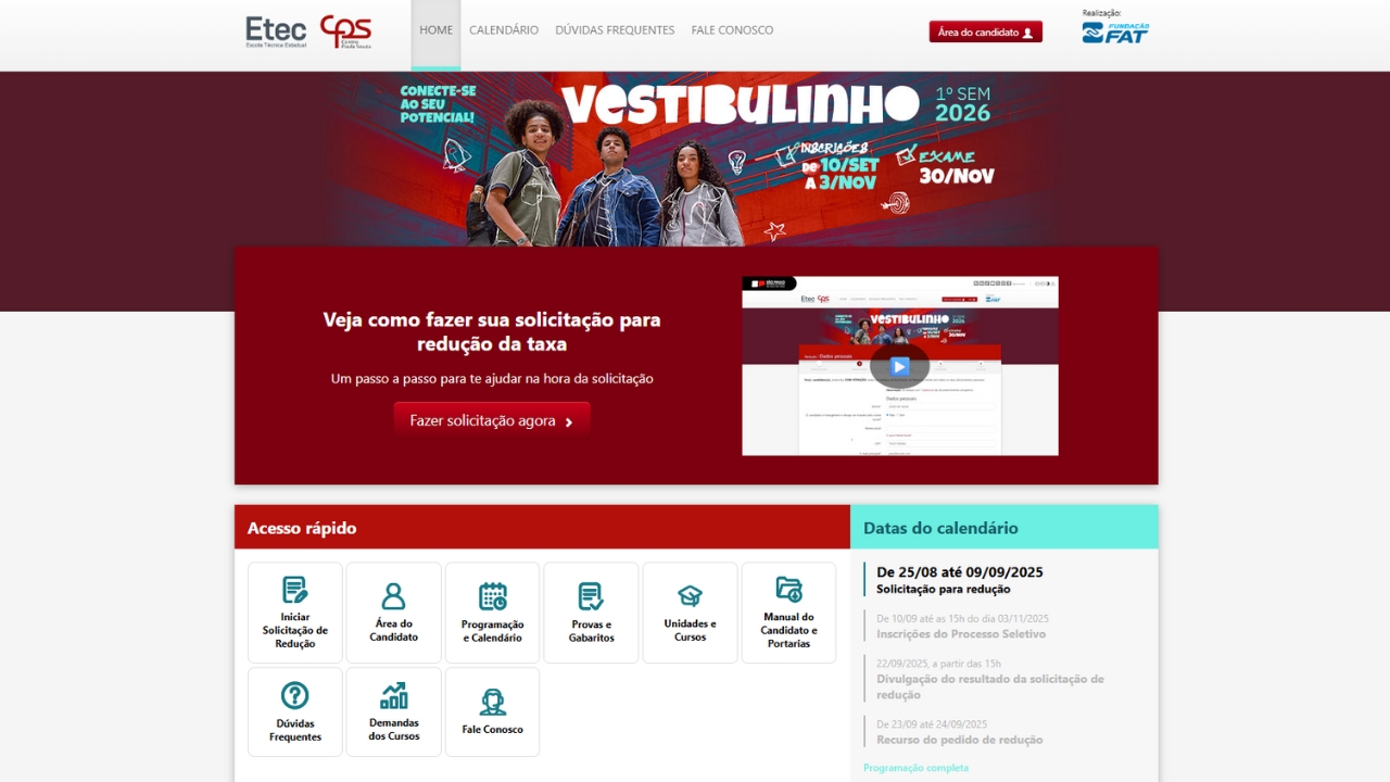 Página oficial do Vestibulinho (vestibulinho.etec.sp.gov.br) | Foto: “print” registrado durante o período de solicitação de redução da taxa de inscrição (25/08 a 09/09/2025).