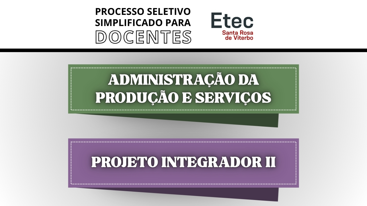 Estamos com duas vagas abertas para a contratação de professores da área de Gestão e Negócios, por meio de dois Processos Seletivos Simplificados para docentes (PSS), editais nº 237/09/2025 e 237/10/2025, para dois dos componentes curriculares do curso de Administração Integrado ao Ensino Médio. Os componentes curriculares ofertados são da área do conhecimento da Formação Profissional, sendo um deles o componente intitulado “Administração da Produção e Serviços” e o outro “Projeto Integrador II“. Qualquer pessoa que possui graduação nos cursos da área de gestão está apta a se candidatar para concorrer à vaga e se tornar um de nossos professores! As titulações aceitas estão listadas na página de inscrição de cada um dos componentes.
